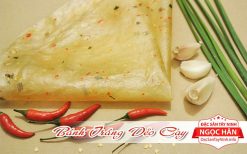 Bánh Tráng Ngọc Hân có vị cay đặc trưng của ớt và thơm của hành tỏi hòa quyện với sự mềm dẻo của màn sương tạo nên vị ngon khó quên chay mặn đều dùng được
